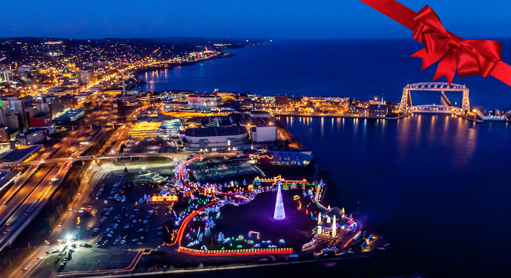 Enjoy an amazing flight over Bentleyville and a great view of the Enger Tower and Aerial Lift Bridge illuminated at night with the holiday lights.